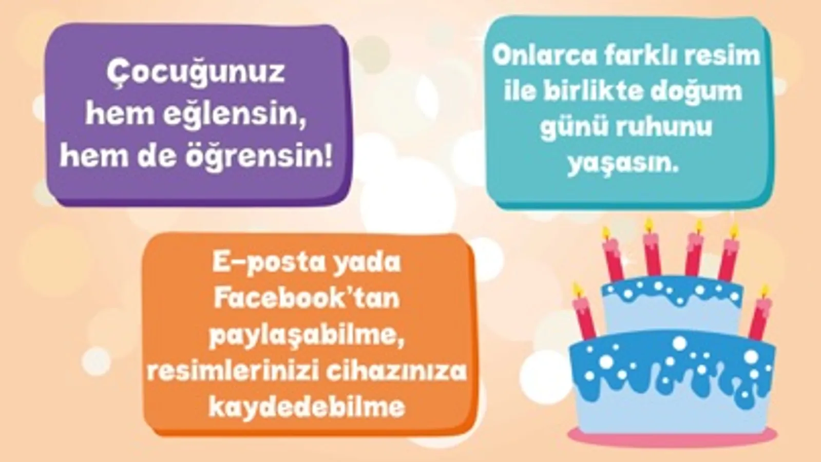 Çocuklarınızın zeka gelişimine oldukça katkı sağlayacak uygulamamız ile birbirinden farklı resimleri boyayarak onların daha iyi bir Doğum Günü geçirmelerine yardımcı olacaksınız. Ayrıca çocuğunuzun yaptığını boyamaları Facebook'ta paylaşabilir, sevdiklerinize e-posta olarak gönderebilir yada kendi resim galerinize kaydedebilirsiniz!