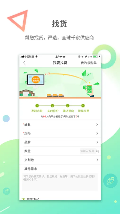 4、免费找货助手、仓储管理、企业白条、仓单融资;及时的大宗农产品行情讯息,手机轻松补仓,卖货无忧!超过千家农产品供应商的入驻选择。