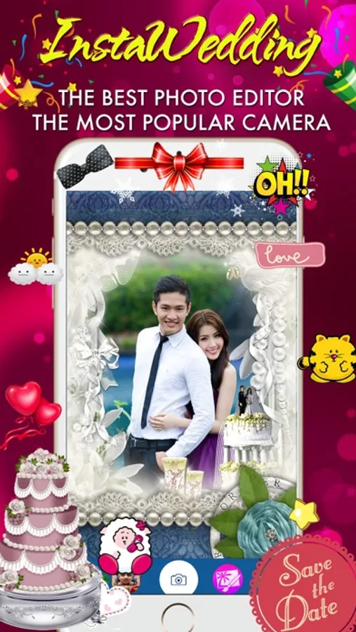 - InstaWedding Photo Frame integrates all kinds of pretty accessories, interesting stamps and fashion text material for you to improvise and enhance your photos!