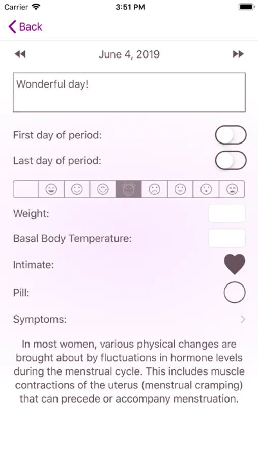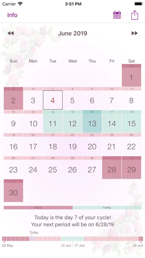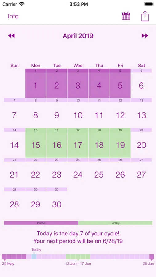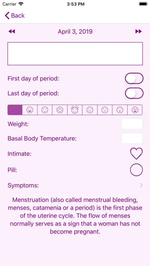 My Period Calendar helps you to monitor and predict your menstrual cycle and your fertile period in a simple and fast way. You can write your daily notes, register your moods, symptoms, weight and much more. You will have many useful informations about your cycle. The data are private, but, if you need, you can generate reports to share the informations that you want.