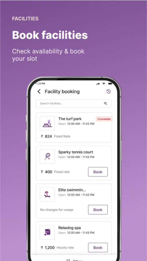 Book a facility such as a tennis court, gym, clubhouse, party hall, etc.