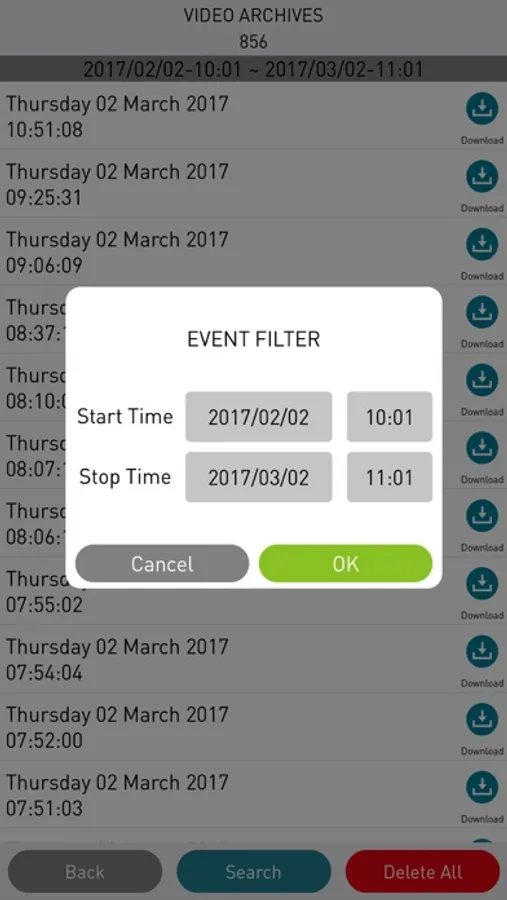 - View the history of motion detection for each camera. Videos can be watched and downloaded directly on your mobile device.