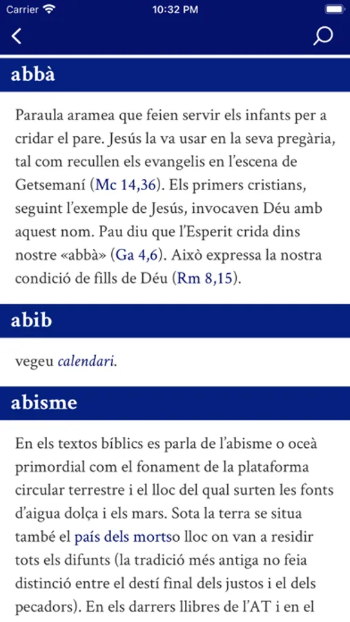 Completa l’aplicació un ric vocabulari bíblic, amb una explicació dels principals termes i noms relacionats amb la Bíblia.