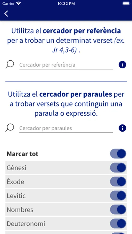 Conté una completa eina de recerca per trobar tots els textos de la Bíblia on apareix una determinada paraula, o bé dues paraules, o una frase, etc. La cerca es pot fer en tota la Bíblia o en els llibres que se seleccionin.