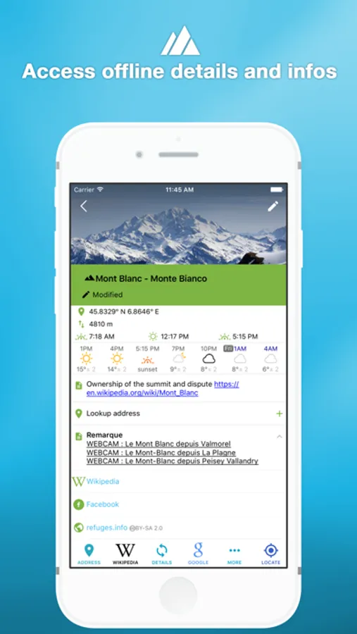 • get details informations for map points like description, opening hours, photos, facebook, phones ... (coming from OpenStreetMap and Facebook)