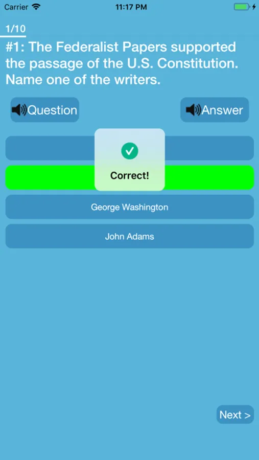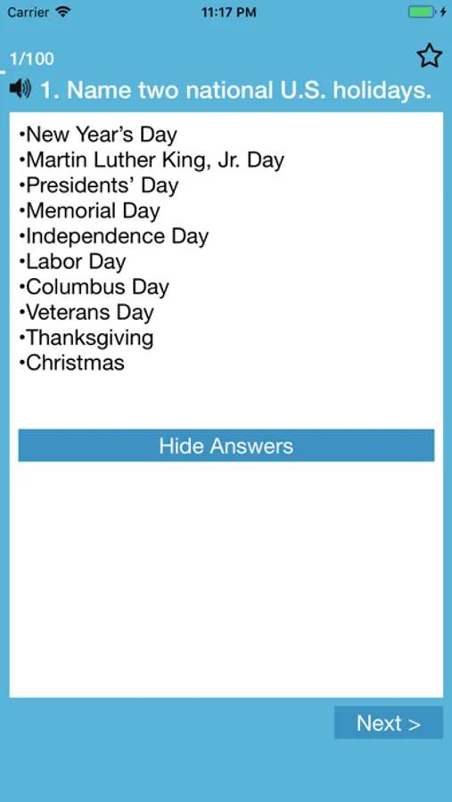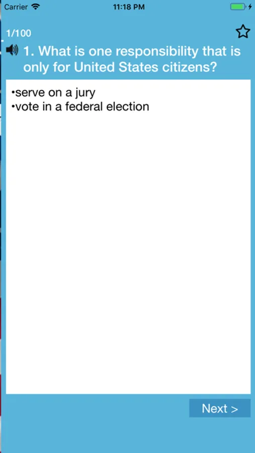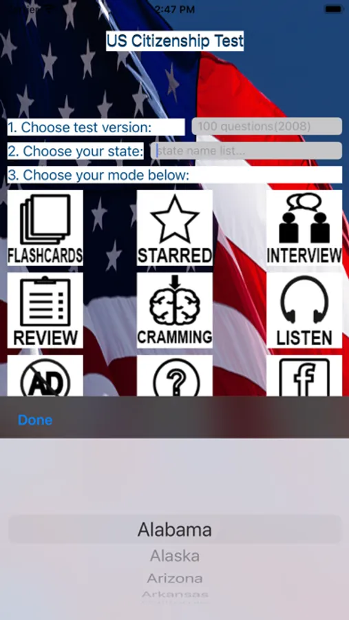 -FLASHCARDS mode: study the citizenship test questions by hiding the answers until you reveal them.
