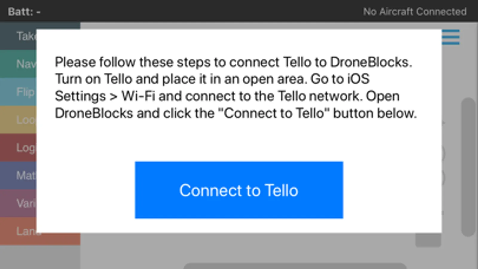 - Tello support: tap on hambuger icon and then tap "Connect to Tello"
