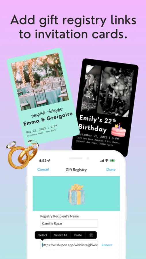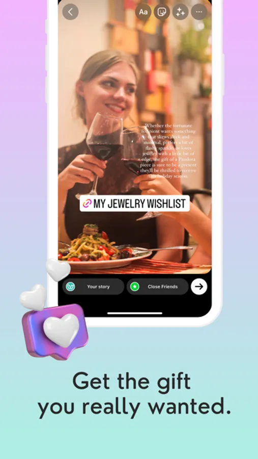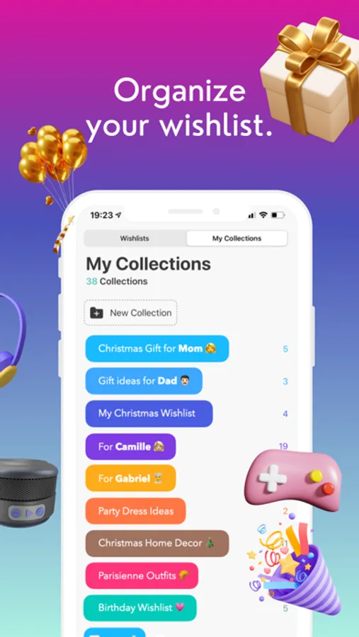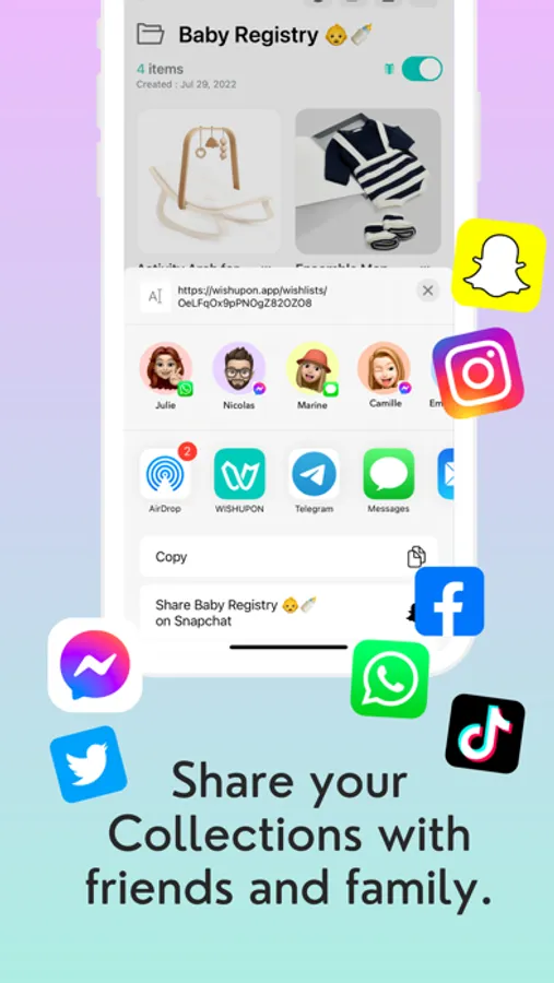 Share your Collections for a wedding registry, a baby registry, etc. So, family and friends can choose a gift and leave a message for you. Then, when they reserve the gift, you will be notified on the app.