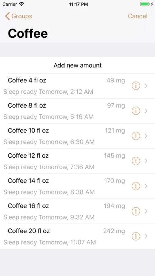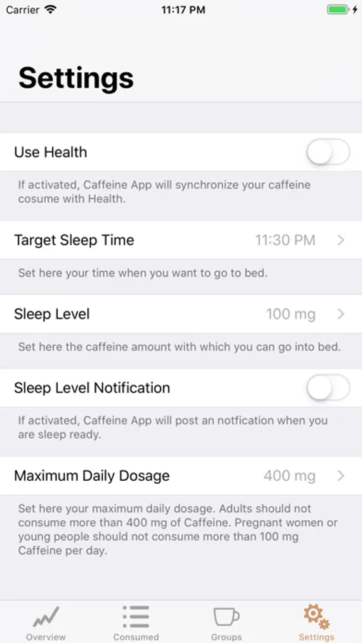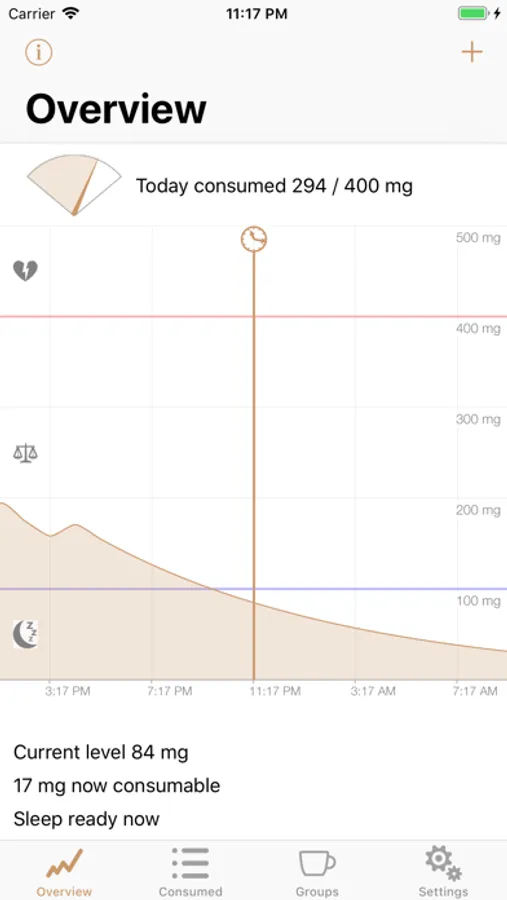 - choose your own sleeping time, caffeine amount with which you can still sleep and the maximum amount of caffeine you want to consume per day
