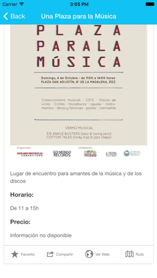 ‣ Open Data = No poseemos los datos. Las asocicaciones o ciudadanos los vuelcan al sistema del Ayuntamiento, y ellos los liberan para que todos podamos reutilizarlos => http://www.zaragoza.es/ciudad/risp/detalle_Risp?id=282 Si encuentras datos incorrectos, eventos duplicados, imágenes que no cargan... no dudes en notificarles en webmunicipal@zaragoza.es y/o datosabiertos@zaragoza.es