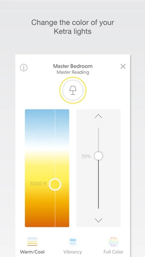 Adjust the brightness, color (warm/cool color temperature as well as full color) and Vibrancy with a quick and simple interface. Ketra lighting can transform your home by changing the mood from warm and relaxing to bright and energizing, enhance the details of your home decor, and add color to accent the environment and create a dramatic or festive mood.