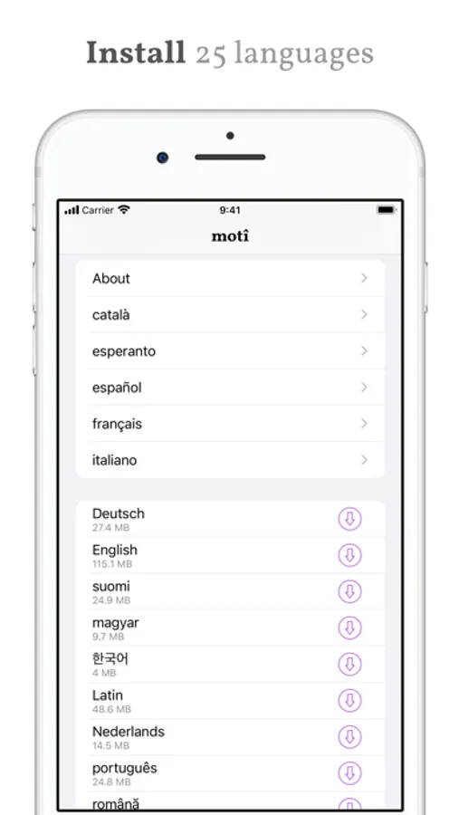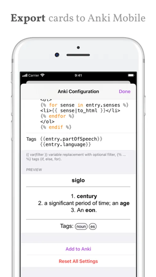Get definitions for words in 25 languages and boost your language learning efforts with flashcards exported to AnkiMobile. Based on free data, without ads, data collection, tracking or in-app purchases.