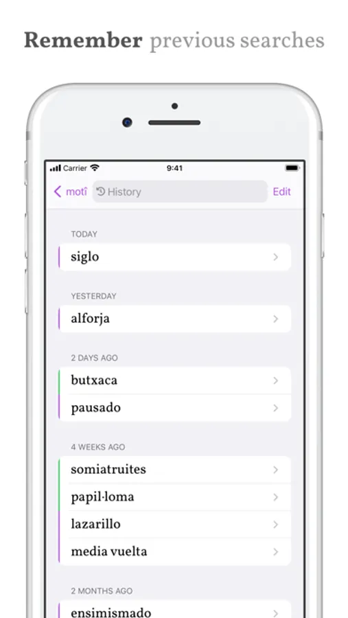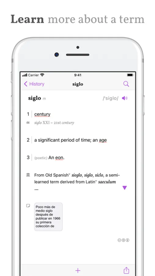 Etymologies help to make connections between new and already familiar words in any language installed, and example sentences show words and phrases from everyday usage.