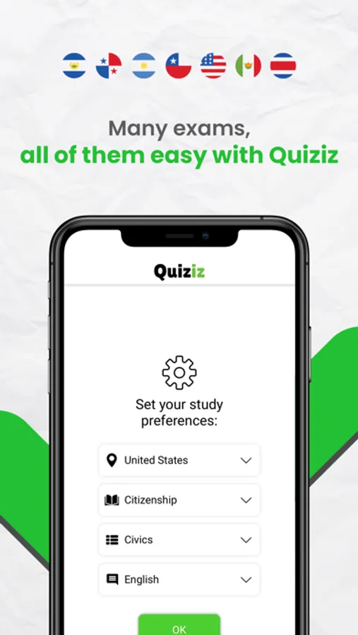 Quiziz is the perfect tool to prepare yourself for many official exams: driving license exam, high school and university admision tests, citizenship and aviation exams; in countries like Costa Rica, Panama, Argentina, Mexico, Chile and US.