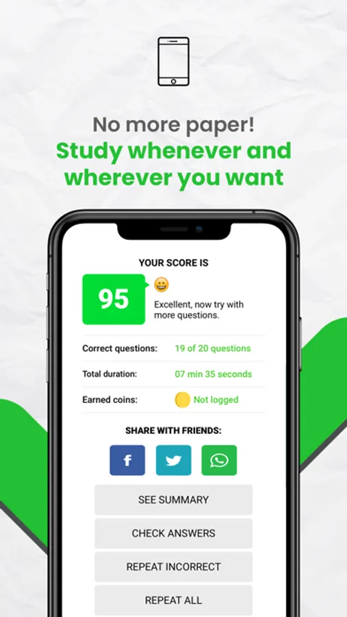 Forget about going two or three times to do an exam. Get ready with Quiziz and pass it at the first try. The best: is free. Besides, Quiziz has a Premium version that allows you to be more prepared with check answers, repeat incorrect and expert level functions. You can activate any of these functions by buying them from the free version anytime.