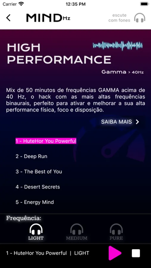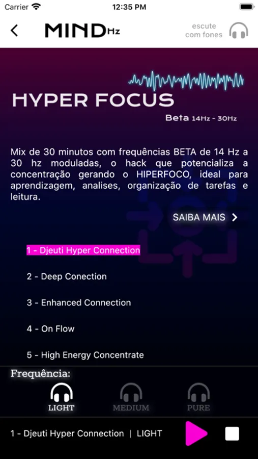 The MindHz app transmits binaural frequencies that synchronize the cerebral hemispheres, unlocking unlimited brain resources, functions as a switch. Scientists call this "synchronization of the whole brain" and when achieved, change your brain experiences in an extremely beneficial way to blood flow, allowing you to quickly enter states of relaxation, hyper focus, high energy, meditation and others whenever you want.