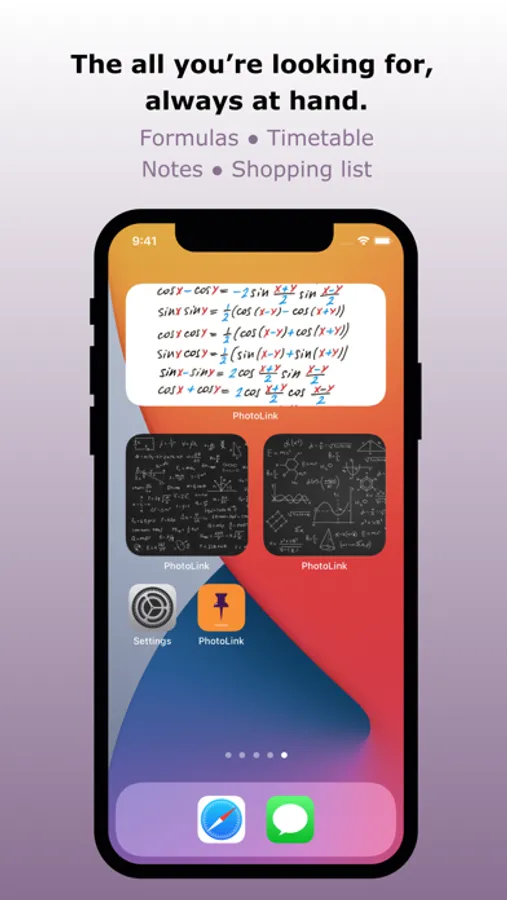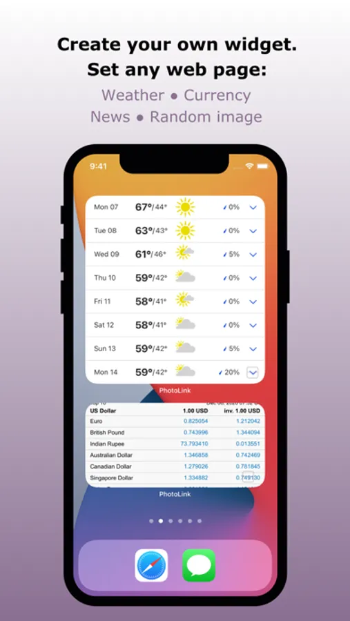 PhotoLink lets you create your own Widget - you can attach your favorite photos (timetable, reminders, quotes, formulas, cribs, notes, shopping list, etc) or save your favorite web-page (e.g. with the weather, exchange rates, etc.) and get quick access to them on the Widget (and even set web page to autorefresh).