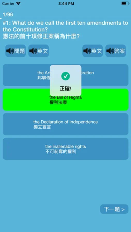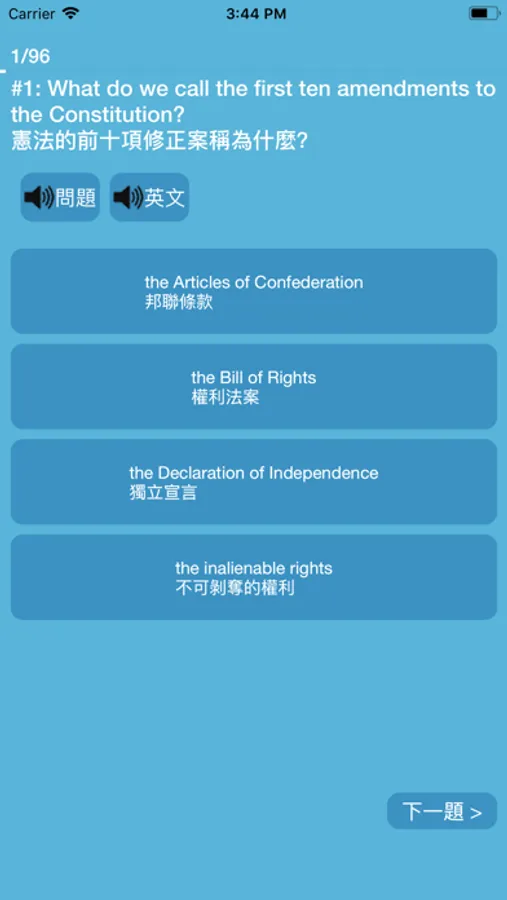 借助此免費的《美國公民實踐測試》廣東話版,您可以為美國公民最終面試做準備。 為了成為美國公民,您需要正確回答十分之六的問題或正確回答二十個問題中的十二個(128個問題)。