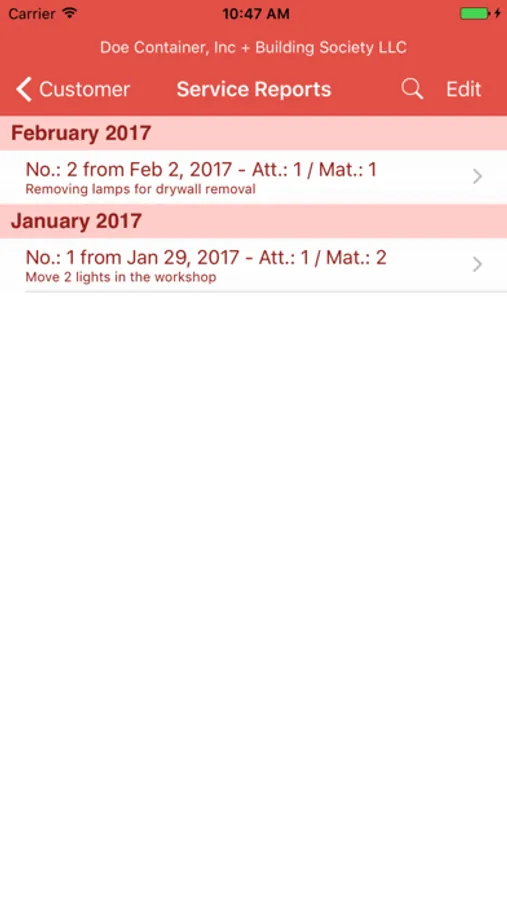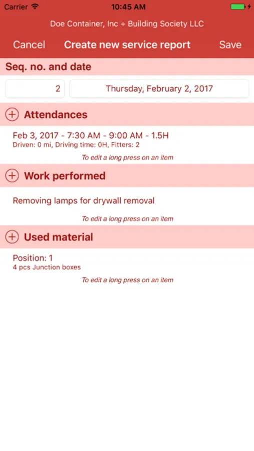 Any number of attendances, executed works and processed materials can be recorded in each service report.