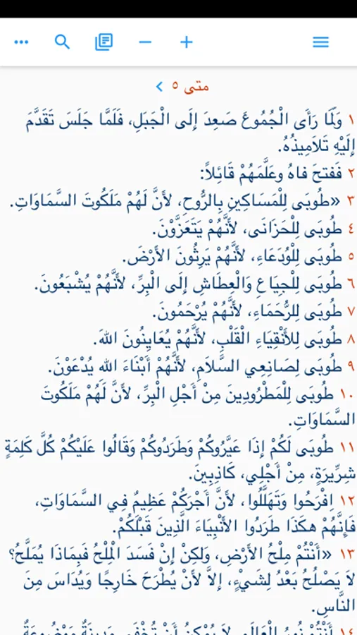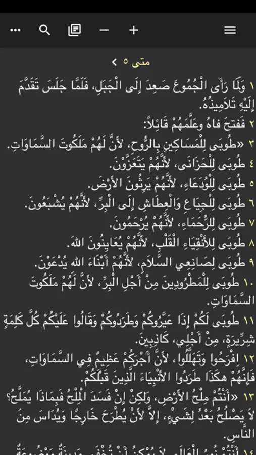Arabic Bible Study Center allows users to read and search the Bible in Arabic with and without diacritic (tashkil). In addition to its advanced search features Arabic Bible Study Center