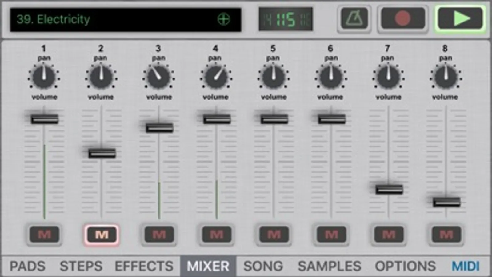 – 8 channel mixer with volume control and mute/solo for any individual instrument