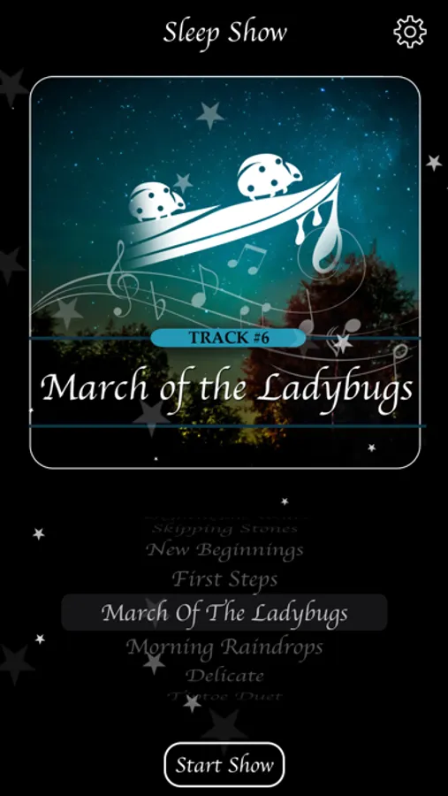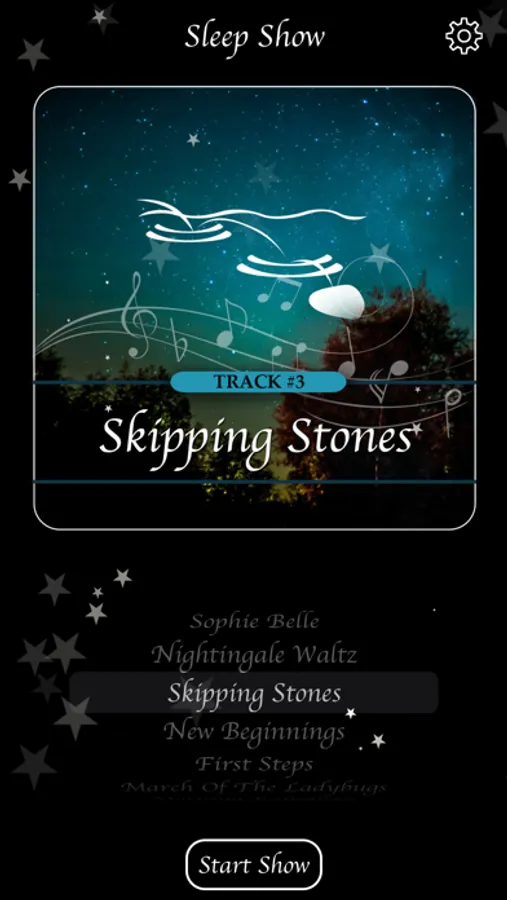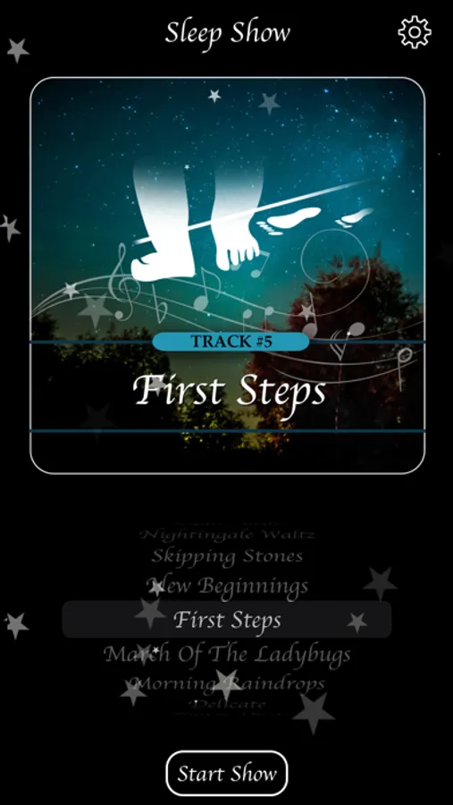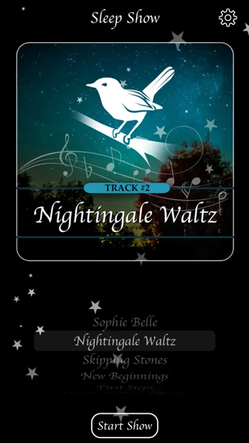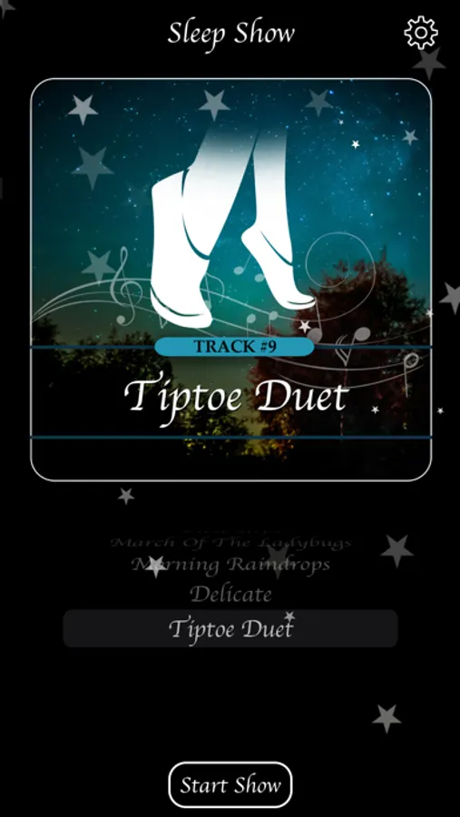 The sound track for Sleep Show is Delicate: Piano Lullabies by J. Cohen, which is available on Apple Music, Spotify, Tidal, and others. The nine piano lullabies become progressively quieter and more soothing with the intention of lulling both of you to sleep.