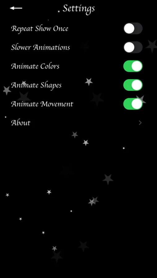 The animations are comprised of shapes and colors that transform in time with the music. This occurs in a randomly assigned order so no two shows are the same.