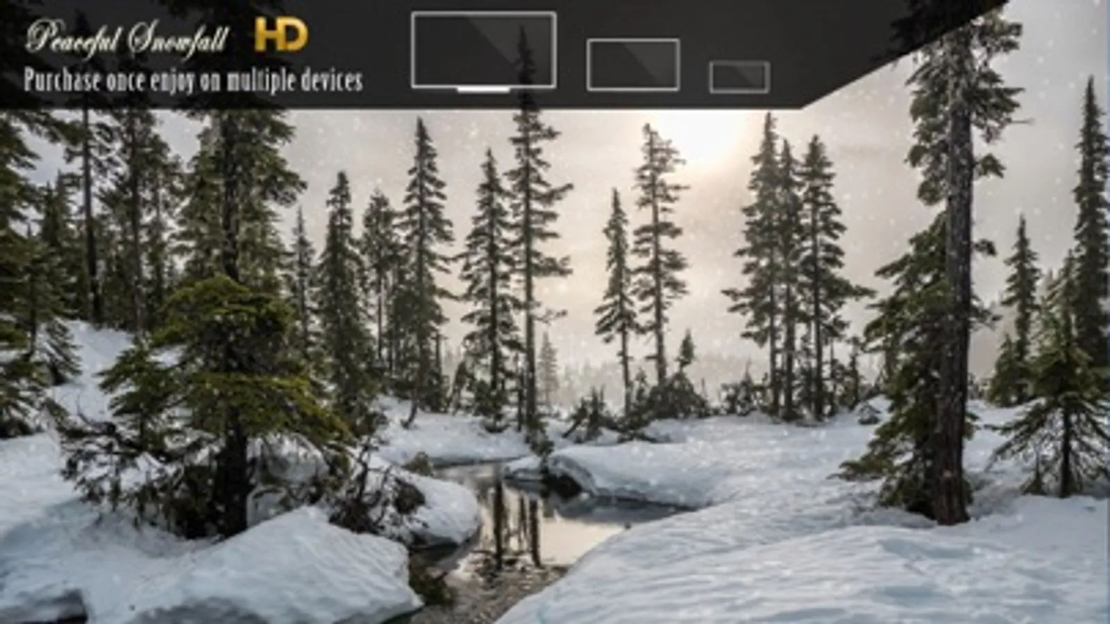 Peaceful Snowfall HD in full screen HD with gorgeous Winter Scenes coupled with real like falling snow, with a choice of ambient and Christmas music and snowfall SFX.