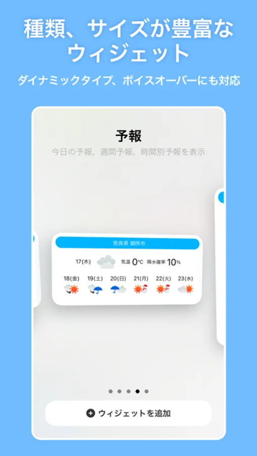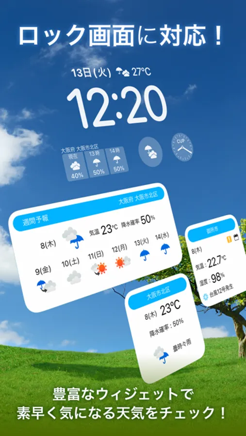 - ウィジェット:天気予報、降水確率、気温。3時間ごとの天気と気温予報をグラフ表示、ヘッドライン表示、登録地域の予報表示