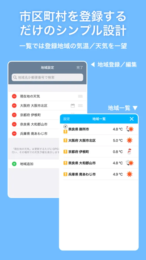 - 市区町村を登録するだけのシンプル設計(GPS現在位置登録や郵便番号検索も可)