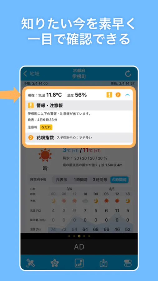 - 現在の気温・湿度やその日の主要な情報をヘッドラインとして最上部に表示