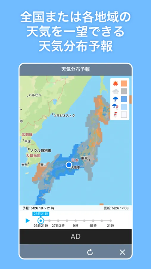 - 天気分布予報(今日・明日の3時間ごとの天気予報を5kmメッシュで地図上に表示)