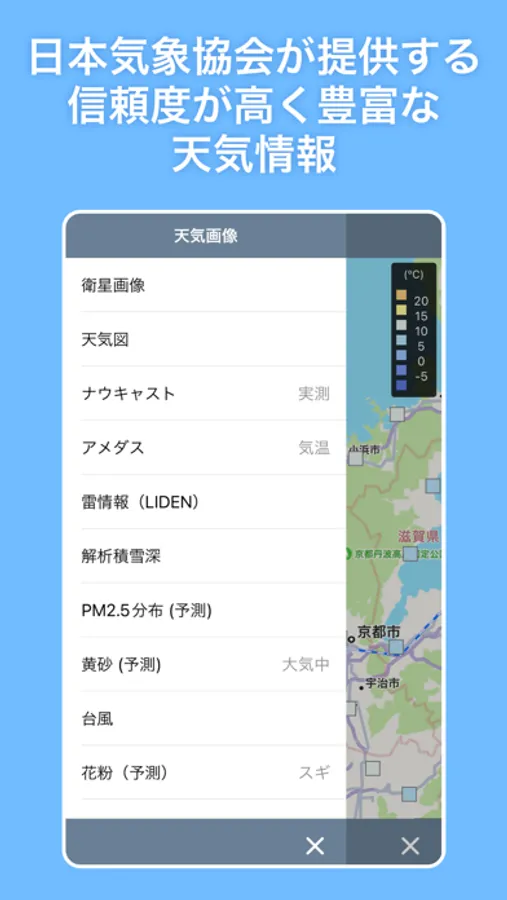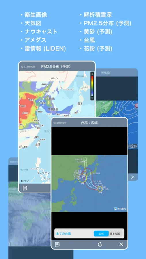 - 天気画像(気象衛星、天気図、高解像度降水ナウキャスト、アメダス各種情報、雷情報、推計気象分布(気温)、解析積雪深、PM2.5予測、黄砂予測、台風、花粉予測)