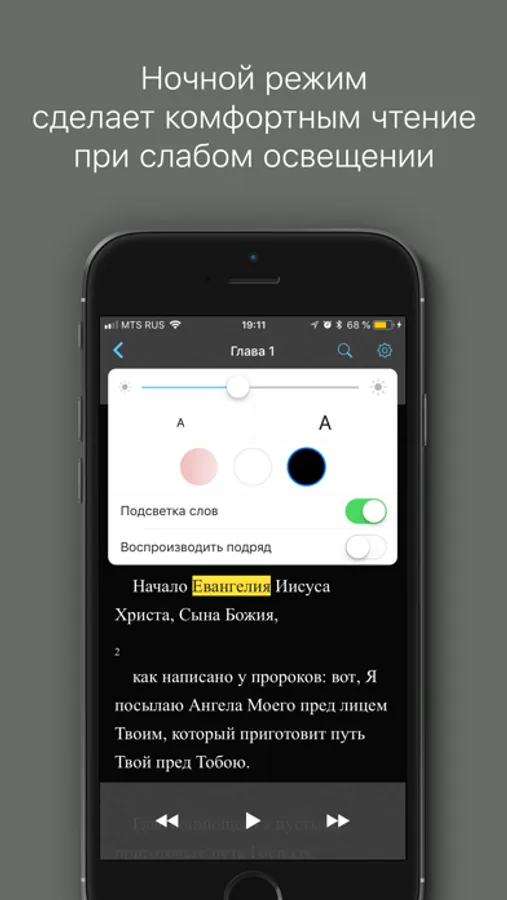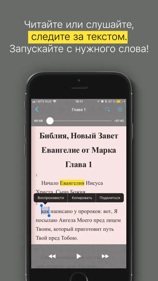 ・Воспроизведение с выбранного слова при помощи долгого касания;