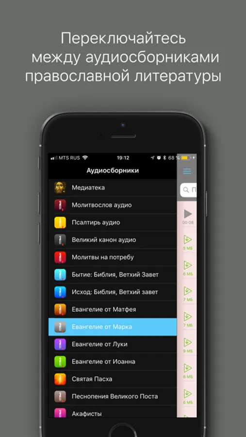 ・Легкое переключение между православными тематическими аудиосборниками через выпадающее меню;
