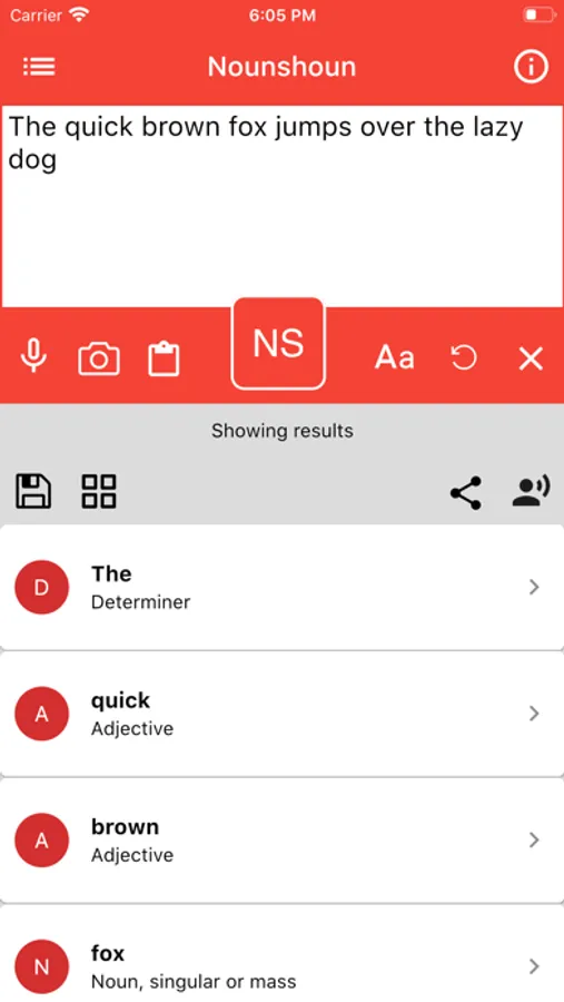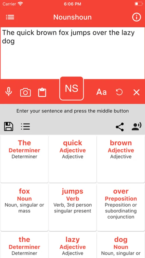 Step 2: Press the NS action button. This will make the app connect to NounShoun servers to find the best possible solution to your sentence.