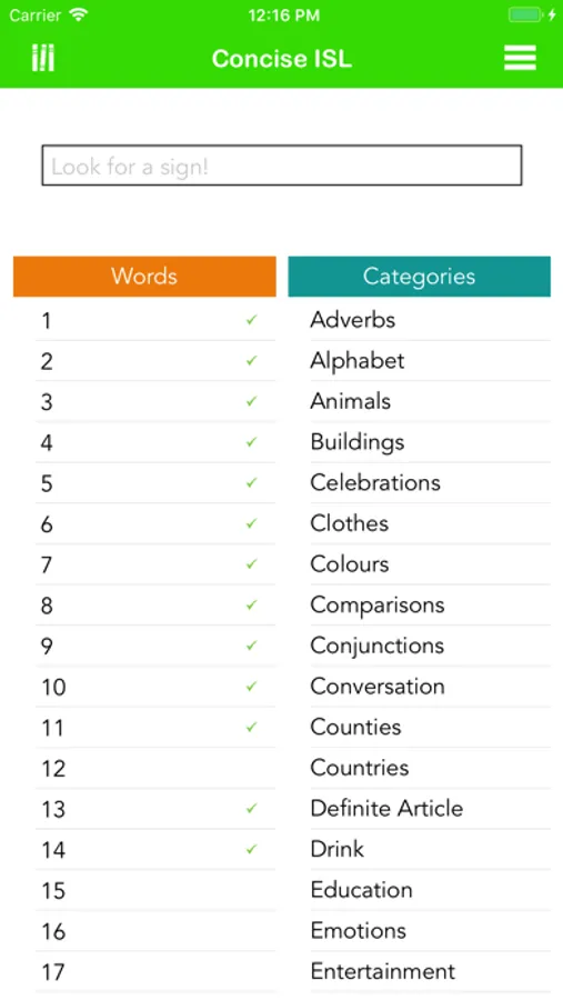 Specific words and categories can be easily found within Concise ISL, using a simple and efficient search interface, swipe gestures, sliding menus and other intuitive interaction mechanisms.