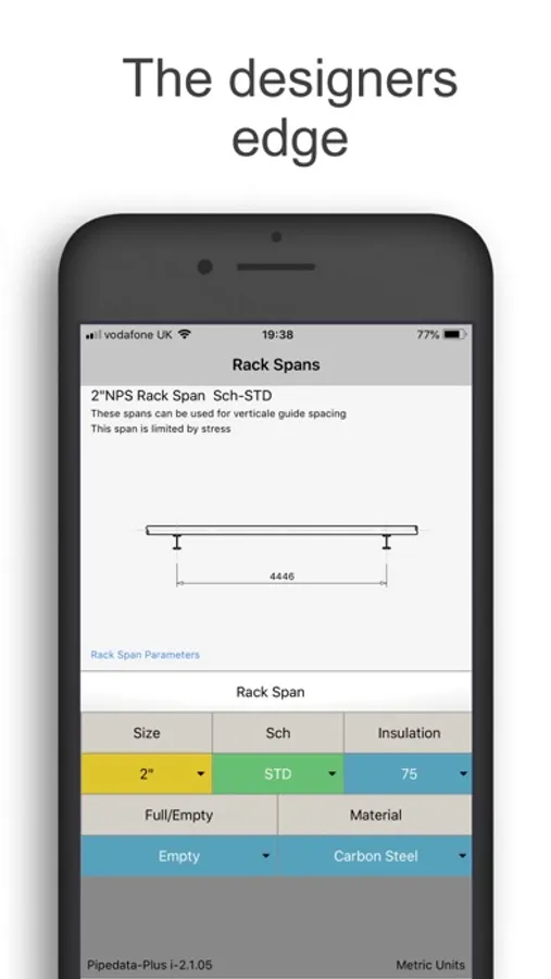 Pipedata-Plus has dimensional and weight information for over 160 common piping components with the addition of specialities such as strainers, weldoflanges etc. Pipedata-Plus also includes design aids, safe spans, pipe flexibility, spacing and more. The interface is enhanced with colour coded components and parameters.