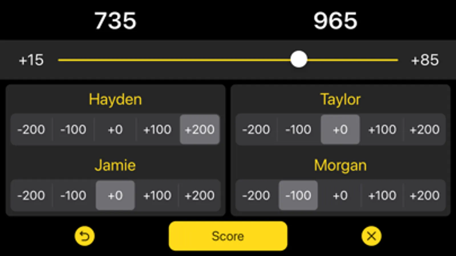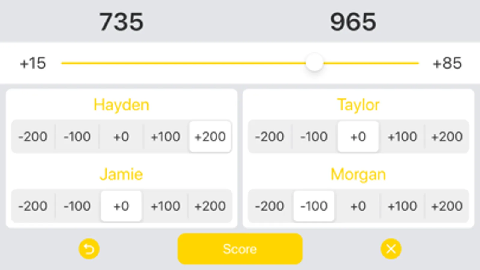 Tichu Buddy's intuitive slider design enables you to quickly divide points between teams or score a double victory by moving the slider all the way to the left or right.