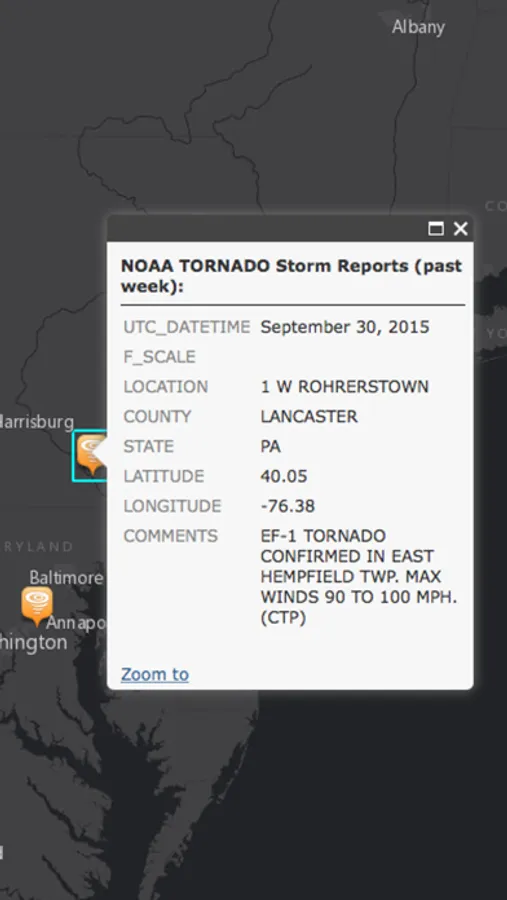 US Weather Storm Reports pulls data from NOAA on the most recent severe storm reports including severe hail, damaging winds and tornadoes. It provides the last 24 hours of reports with up to 7 days of tornado reports. The map includes address search as well as GPS location.