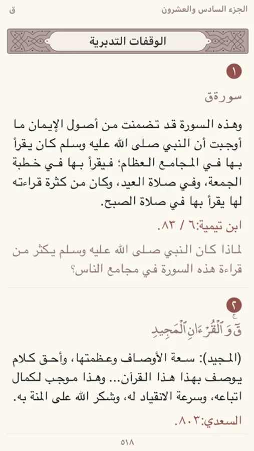 ١ – الوقفات التدبرية: سبع وقفات تدبرية اعتنت بمقاصد الآيات (الإيمانية، والتربوية وغيرها) استخرجناها من ستة عشر كتابًا من أمهات كتب التفسير المعتمدة لدى أهل السنة والجماعة، والتزمنا فيها بنص كلام المفسر إلا إن وُجِد خطأ في بعض الألفاظ من حيث الطباعة أو اللغة والإعراب ولا يحتمل الصحة بأي وجه، فحينها نصحح الكلمة ونضعها بين معكوفين هكذا [ ]. وذكرنا في آخر كل وقفة مرجعها؛ معتمدين في ذلك ذكر اسم المفسر بدلا من اسم الكتاب، ثم رقم الجزء والصفحة وفق الطبعة المعتمدة في المشروع