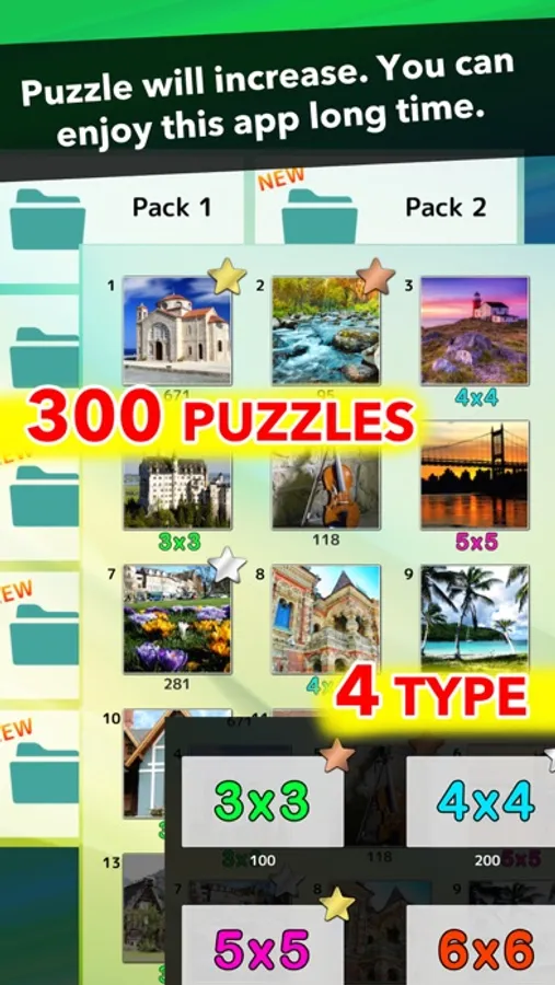 - 4 various sets of tiles: 3x3, 4x4, 5x5, 6x6.