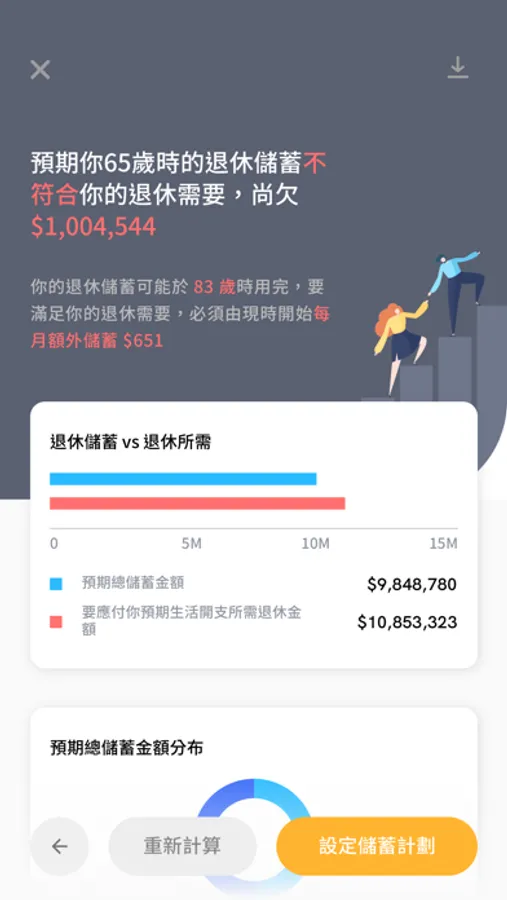 計算你喺65歲時累積到嘅儲蓄夠唔夠應付退休需要,並提供參考數據助你訂立合適嘅儲蓄目標