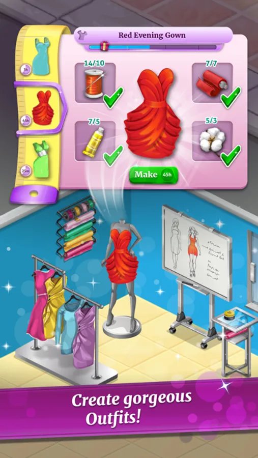 From glamorous dresses, jackets, to trendy shirts and shoes, hundreds of outfits lie at your fingertips. Collect design materials to create the perfect fashions that your customers will love!