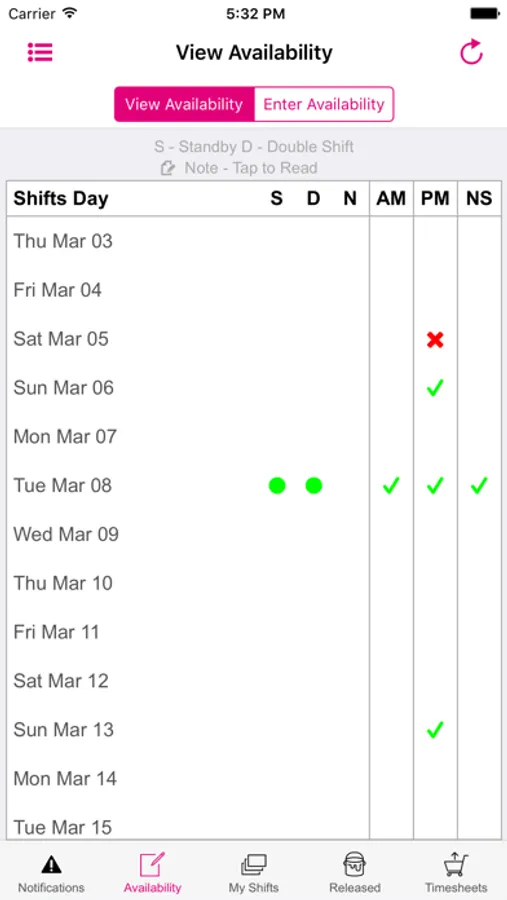 • Availability - View &/or Enter up to 2 weeks availability, including options for Standby, Double Shift and All Day Off.