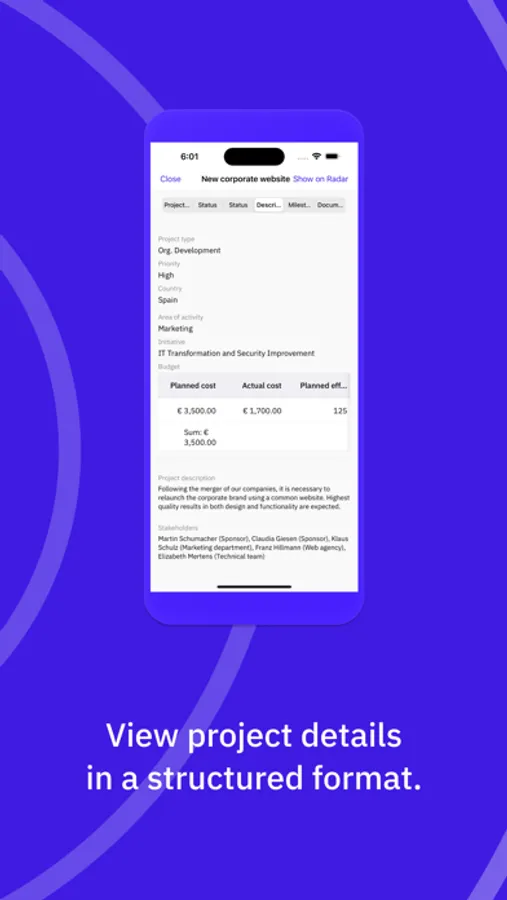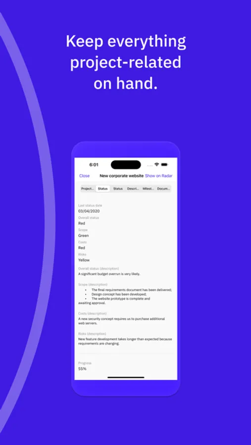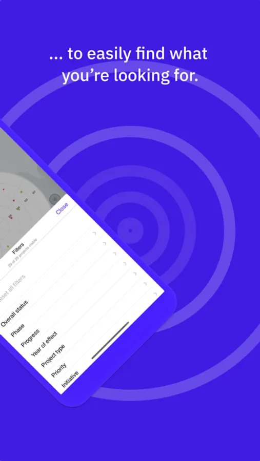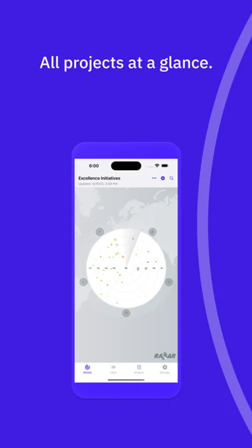 With the RADAR views as a Big Picture, you instantly see where your projects stand and can get to any level of detail that you require. Use the interactive features to change your viewing perspective, filter the data, or dive into single status reports and learn more about the latest project updates. The Projects RADAR app is a complementary viewing tool to the RADAR web application (https://projects-radar.net).
