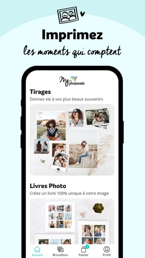 Photoweb est le pionnier de l’impression de vos photos sur Internet. Notre appli mobile myPhotoweb vous permet de transformer rapidement et facilement vos plus beaux moments en de superbes Tirages photo, Livre ou album photos, Tirages rétro, Calendriers personnalisés, Toiles photo, Posters encadrés ou Magnets. C’est le cadeau parfait pour garder ou partager un souvenir de vacances, d’une naissance, d’un mariage, d’un anniversaire ou encore d’un week-end entre amis.