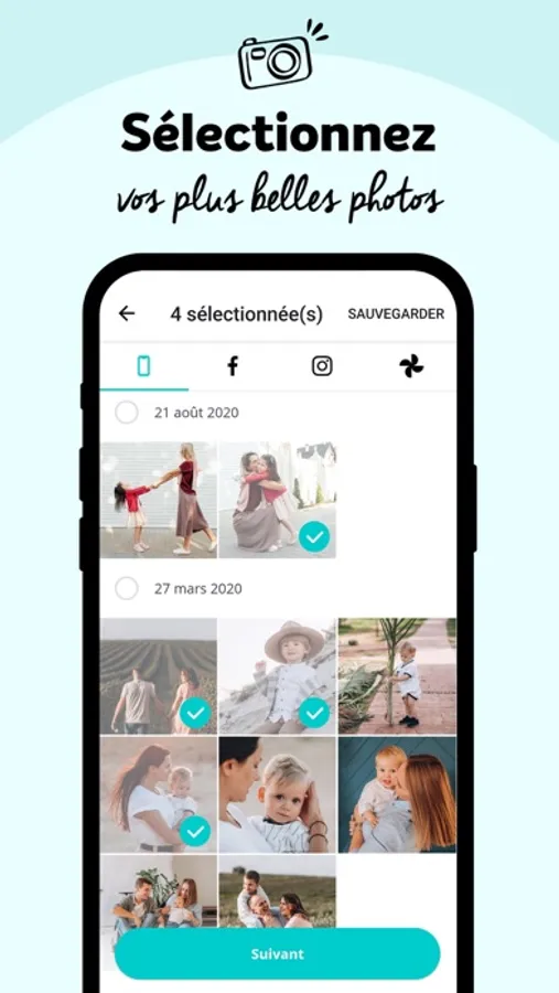 - SÉLECTIONNEZ vos plus belles photos stockées sur votre téléphone, sur Facebook ou Instagram