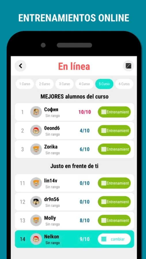 - Aprendizaje en línea: en este modo vas a aprender con estudiantes de tu mismo curso, seleccionando la traducción correcta para 10 palabras y tratando de subir en el rango del curso hasta alcanzar la posición más alta.