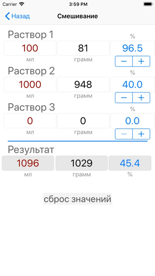 Калькулятор для расчета необходимого количества спирта и воды (или растворов) для получения спиртовой смеси нужной крепости. Расчет производится по таблицам , с учетом контракции.